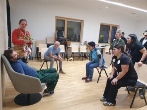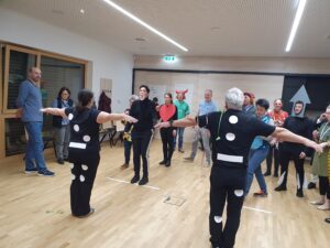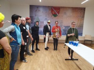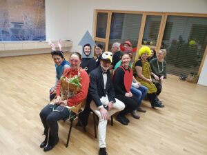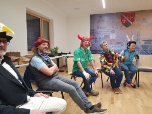 Zu Beginn teilten sich die Teilnehmenden in zwei Gruppen: Eine „Selbsthilfegruppe“ für Menschen mit besonders dramatischen Faschingserlebnissen und eine fröhliche Partygruppe. Doch lange blieben sie nicht getrennt – zum Glück fanden alle schnell zusammen!